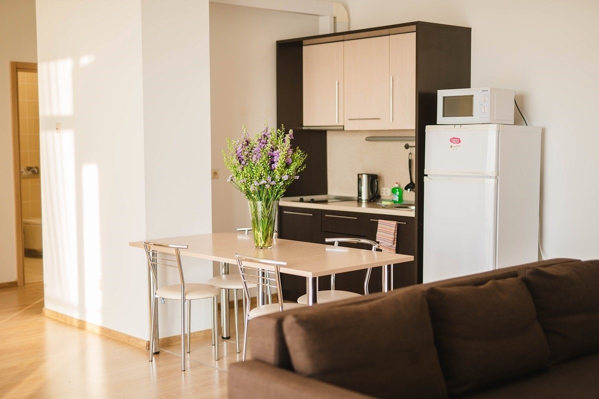 Оборудованная кухня (холодильник, микроволновая печь, мойка, электроплита, набор посуды и столовых приборов)