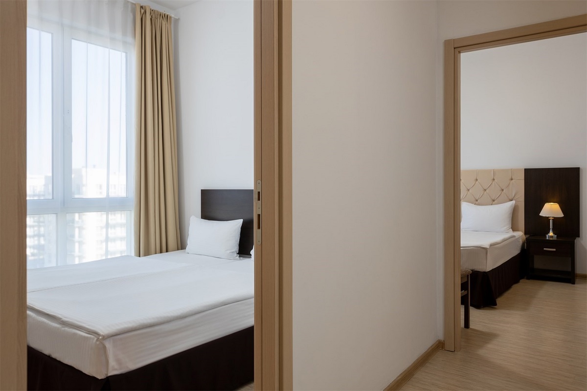 Просторный номер с двумя спальнями, гостиной и ванной комнатой. На первых этажах находится терраса, в остальных балкон с красивым видом на побережье Сириуса, парк или уютный двор квартала. Категория номера: Первая.