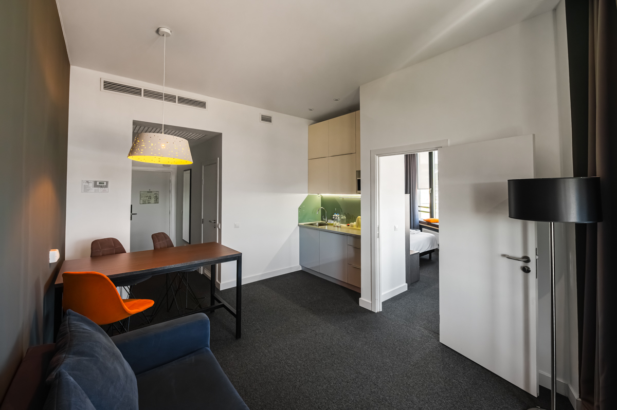 Просторные элегантные номера оборудованы всем необходимым для комфортного отдыха до пяти гостей. Номер состоит из спальни и функциональной гостиной, имеющей разделение на зону отдыха с диваном и небольшую кухню. Прекрасным дополнением станут красивые виды на Олимпийский парк, Кавказские горы или трассу Формула 1. Первая категория.