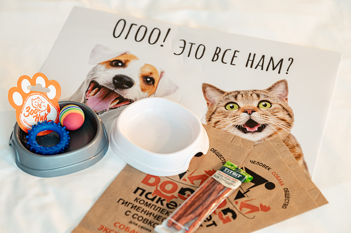 При заселении гостям с животными предоставляются аксессуары для питомца. Для собак: игрушка, лакомство, миска для еды и воды, термосалфетка и гигиенический пакет. Для кошек: игрушка, лакомство, миска для еды и воды и термосалфетка.