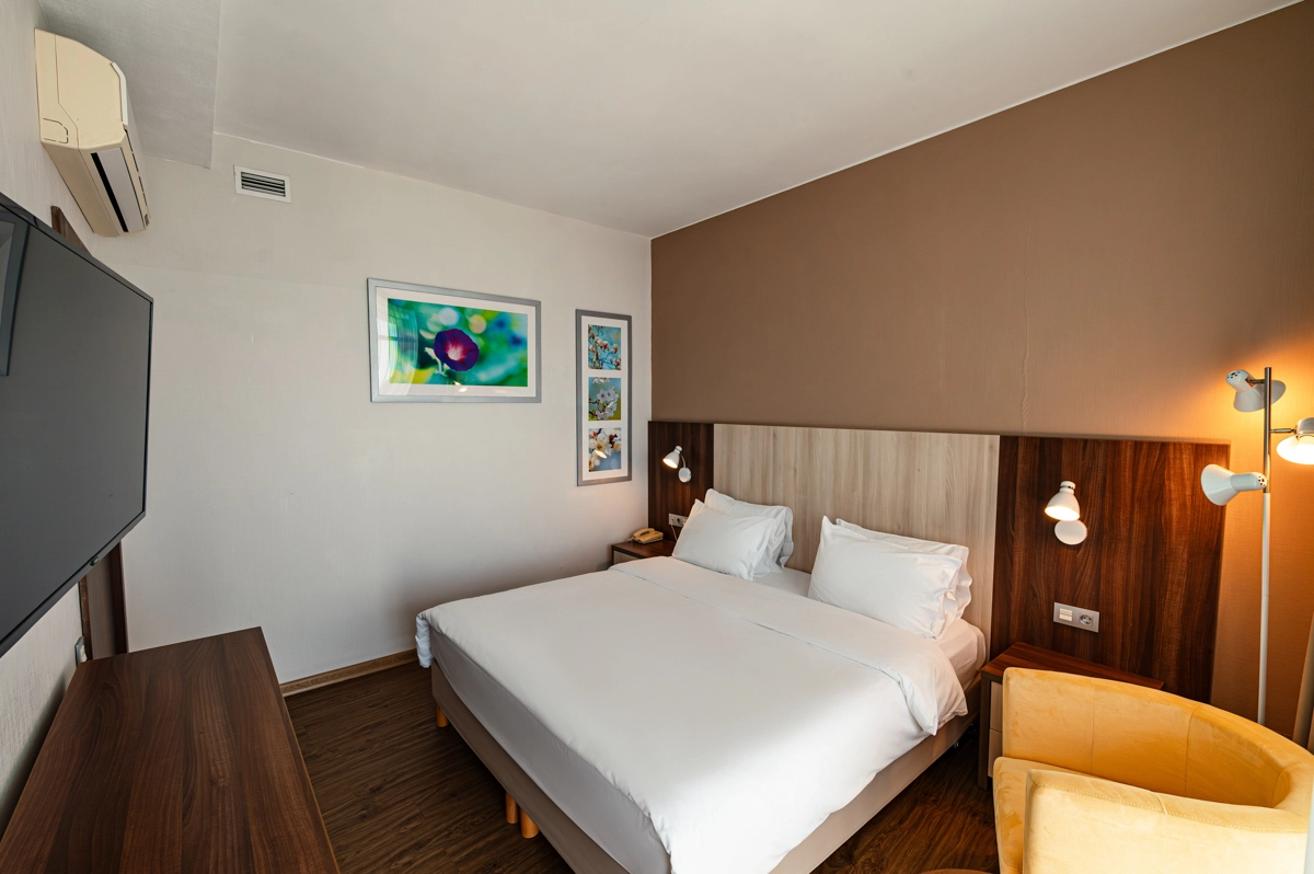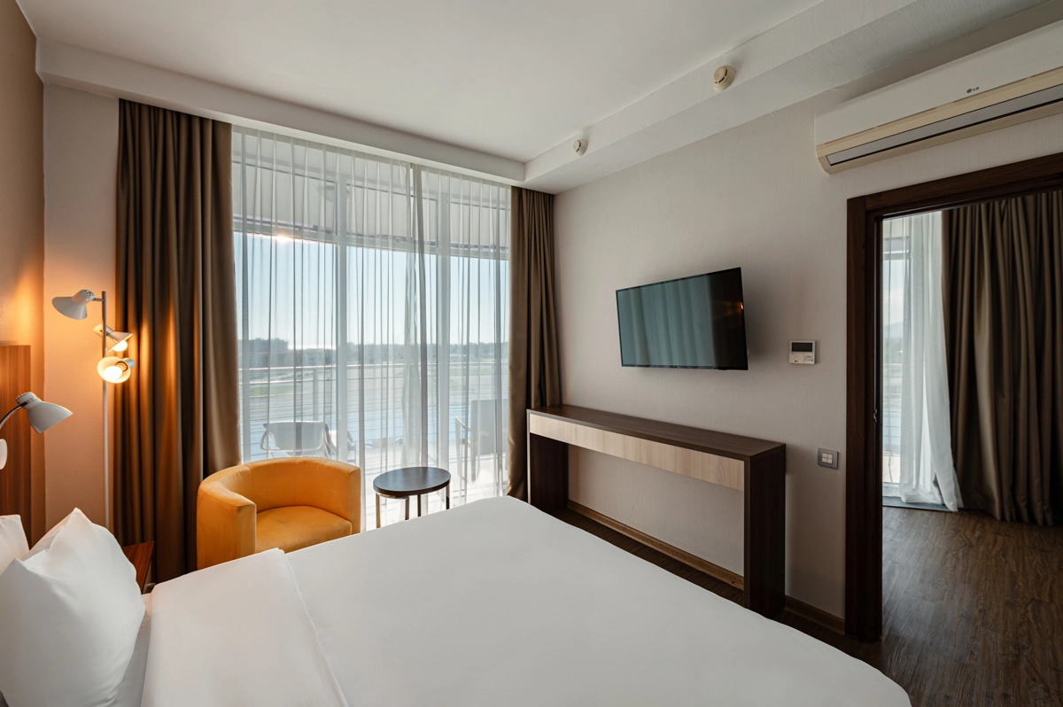 Просторные функциональные номера улучшенной комплектации – отличный вариант для семейного отдыха. Номер оснащен большой двуспальной кроватью и раскладывающимся диваном, что позволяет с комфортом разместить до 4 человек. Прекрасное дополнение к отдыху – балконы с живописным видом на Чёрное море. Высшая категория «Сюит».