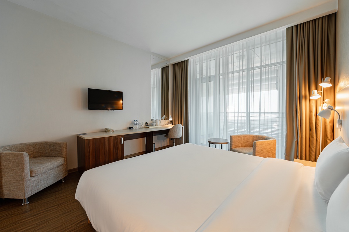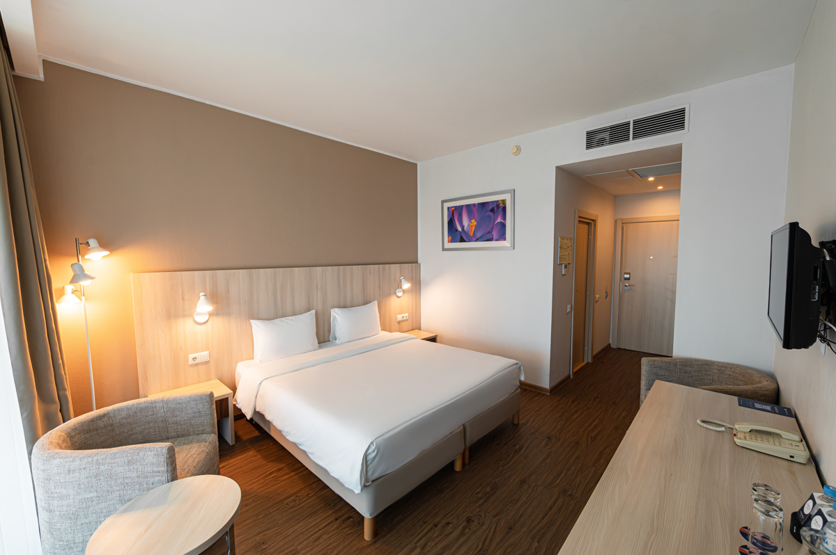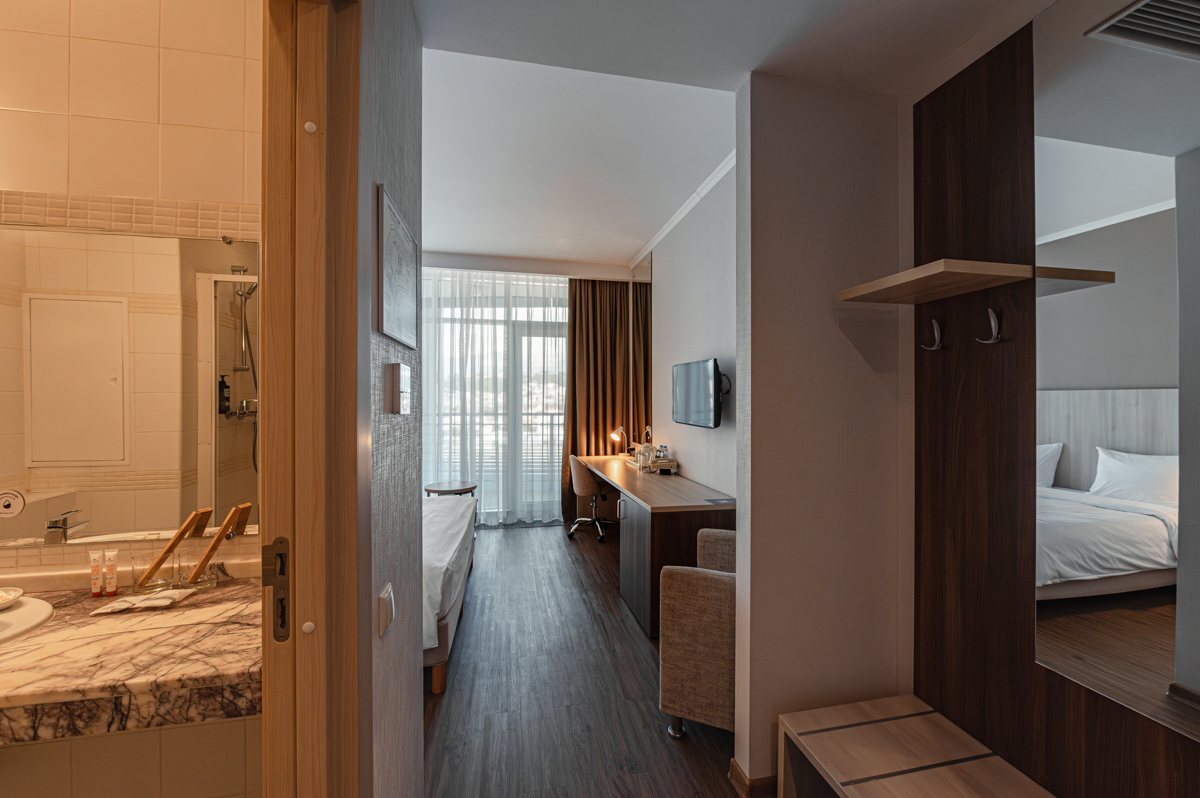 Уютные однокомнатные номера оборудованы большой двуспальной кроватью и всем необходимым для комфортного отдыха. В каждом номере имеется балкон с потрясающими видами на Кавказские горы. Первая категория.