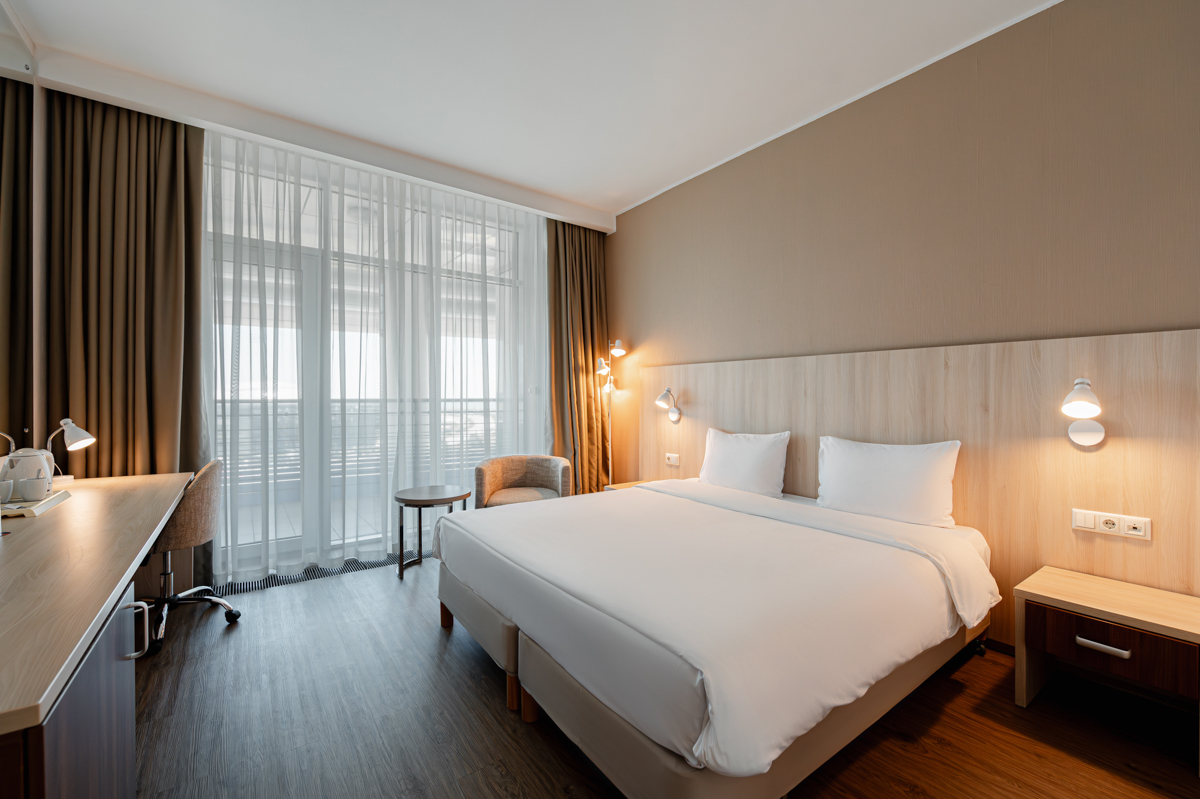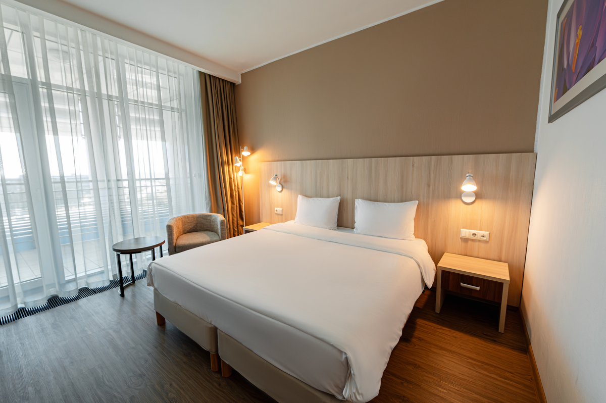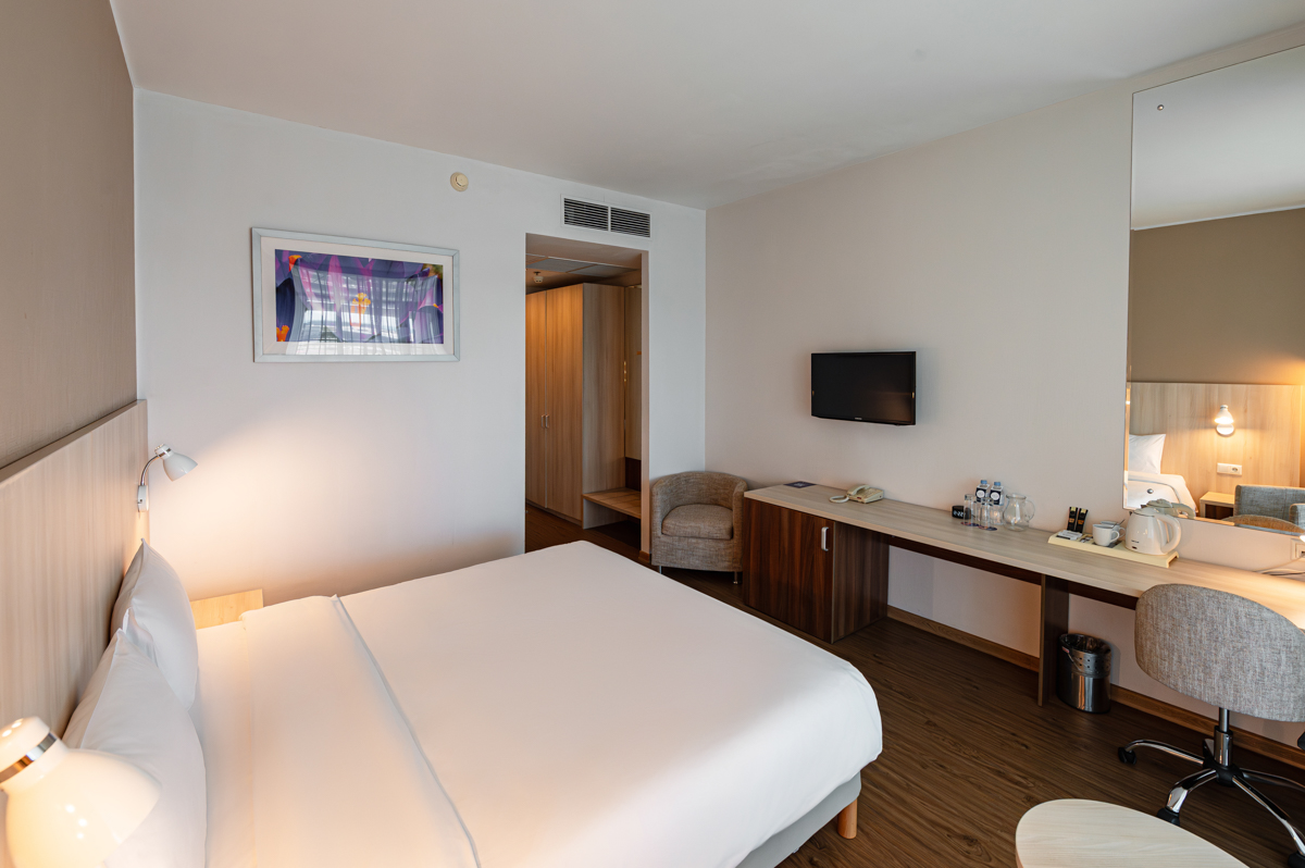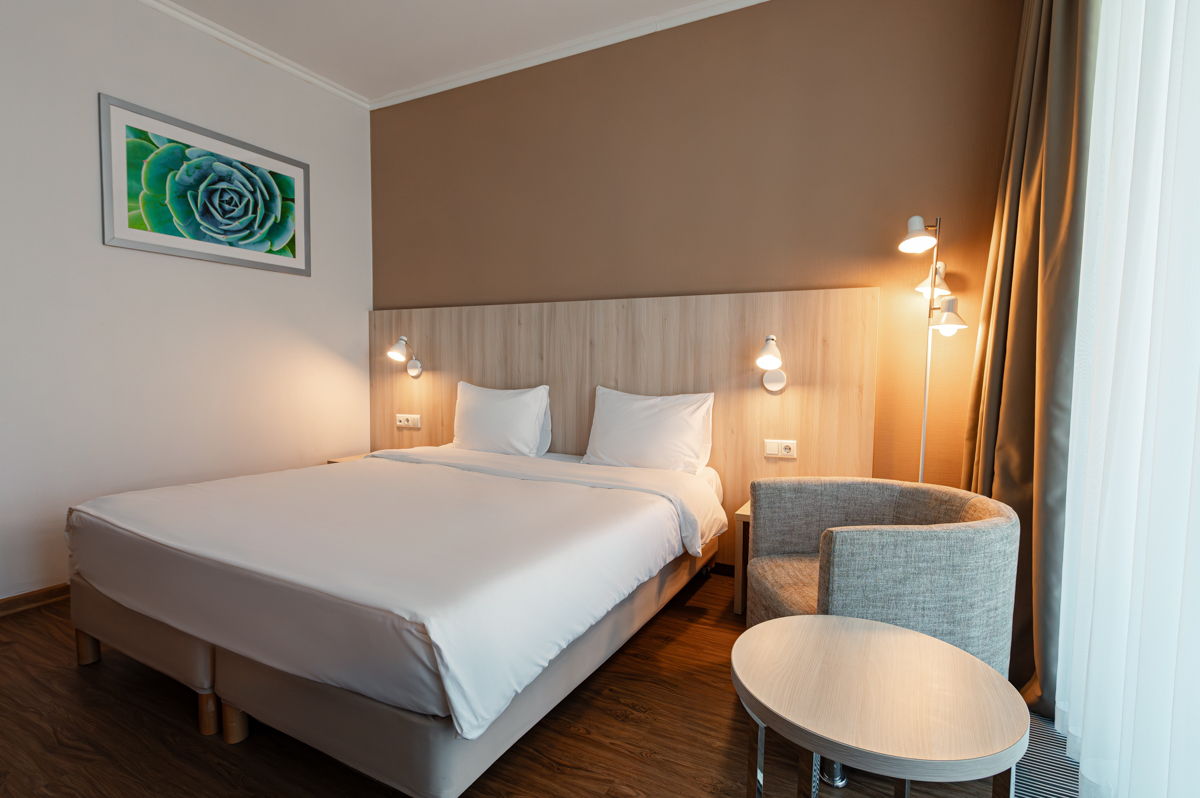 Уютные однокомнатные номера оборудованы большой двуспальной кроватью и всем необходимым для комфортного отдыха. В каждом номере имеется балкон с потрясающими видами на Кавказские горы. Первая категория.