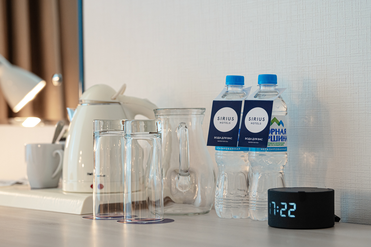 Чайная станция (чай, кофе, сахар), бутилированная вода (при заселении)